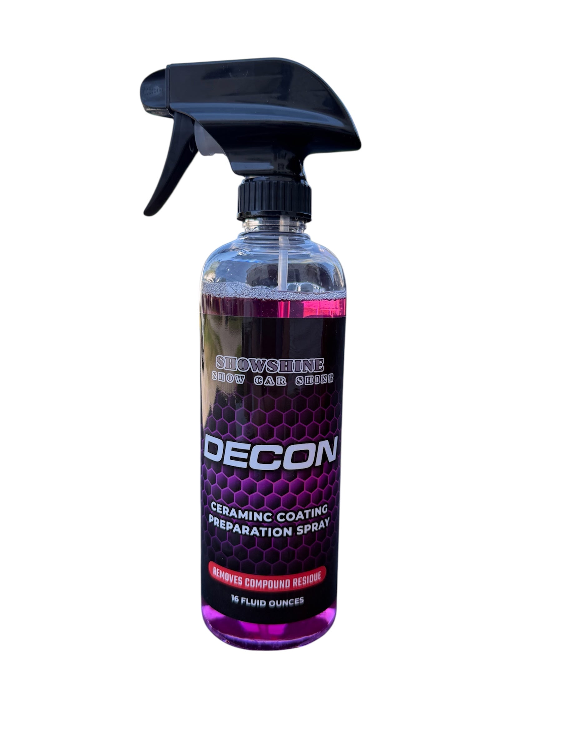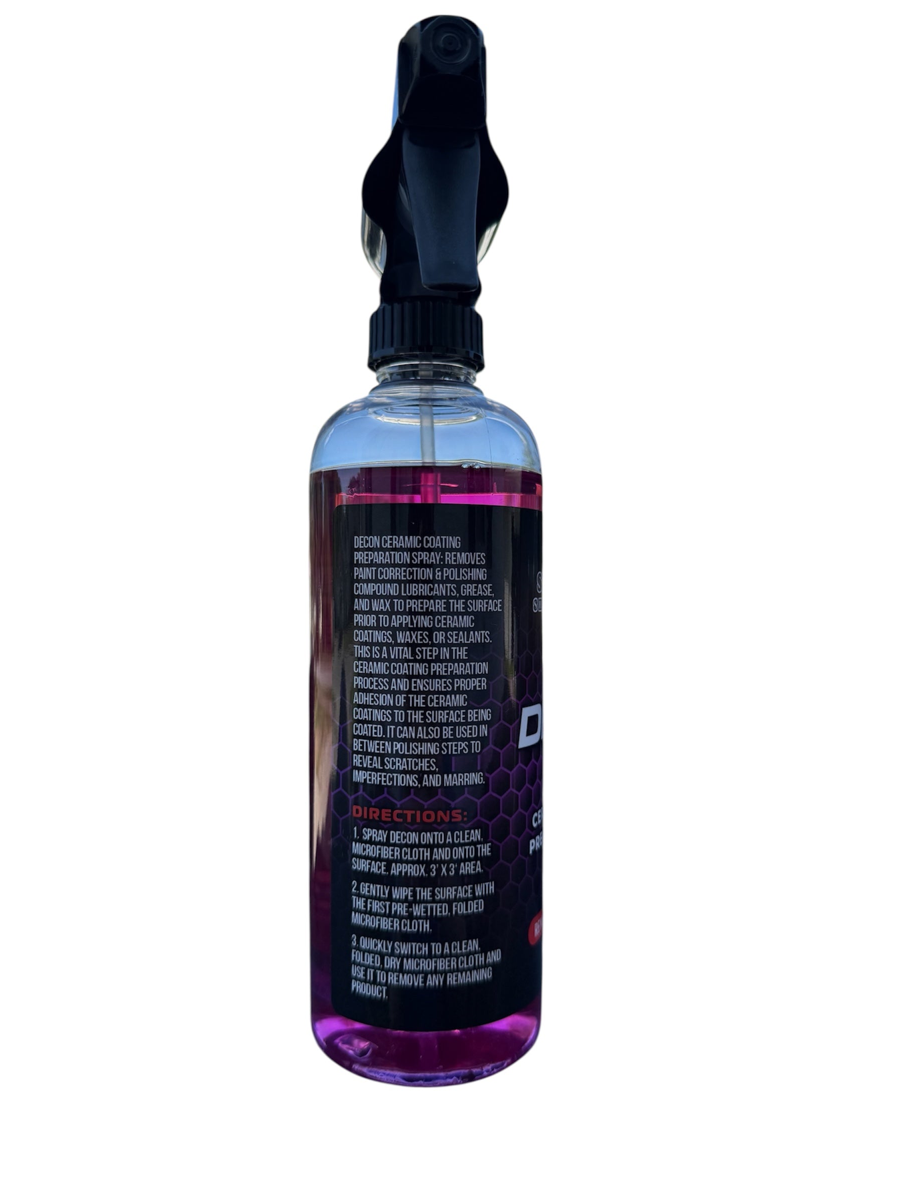 Decon removes polishing oils & compound lubricants, grease, and wax to prepare the surface prior to applying ceramic coatings, waxes, or sealants. Use in between polishing steps to reveal scratches, imperfections, and marring.