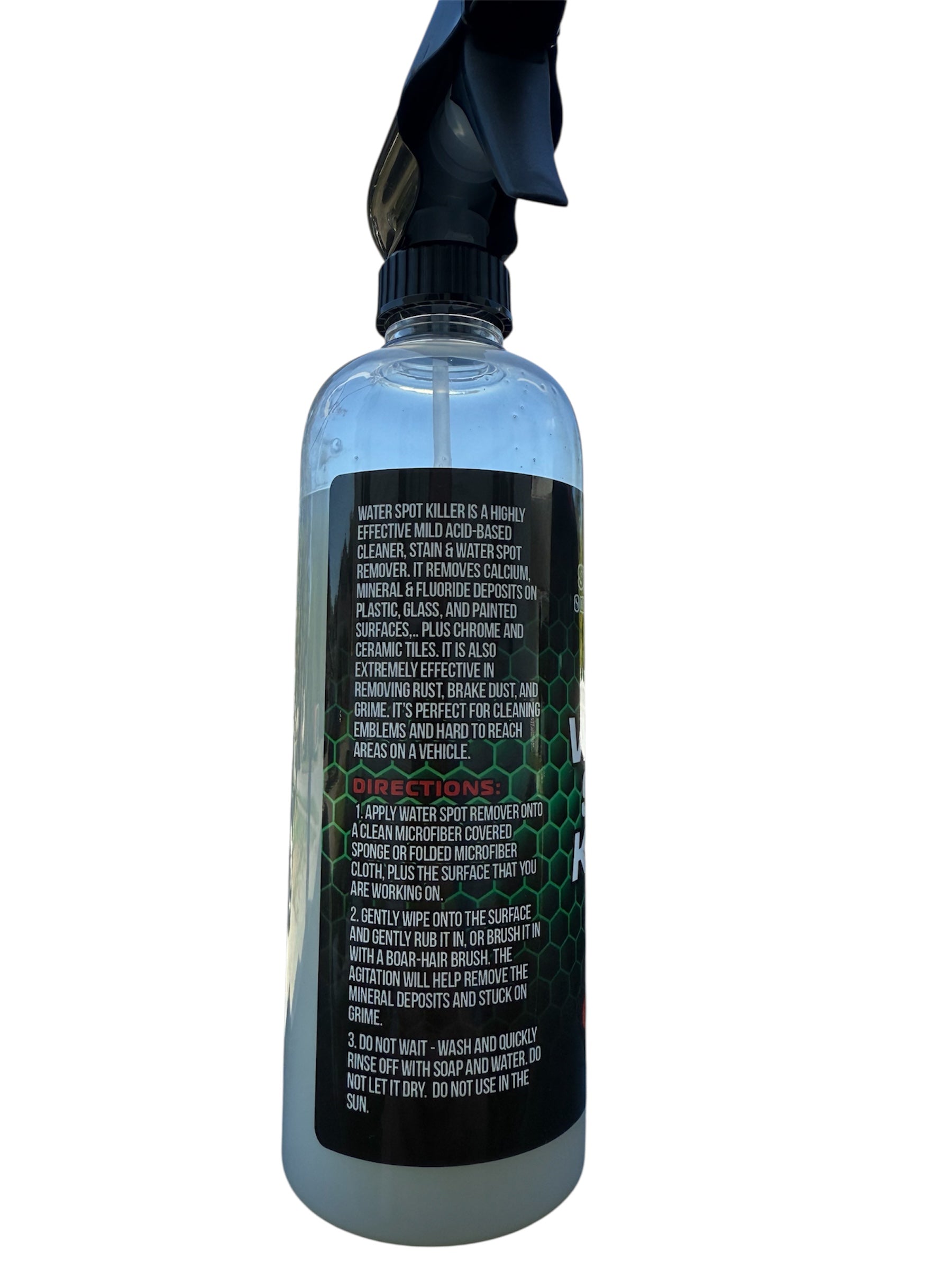 Water Spot Killer is a highly effective, mild acid based cleaner that acts as a stain and water spot remover, and wheel cleaner. Water Spot Killer easily removes calcium, mineral and fluoride deposits on plastic, glass, painted surfaces and chrome. This spray-on cleaner can be used for car emblem restoration, paint decontamination and more! Experience the magic for yourself - Order your bottle of Water Spot Killer today.